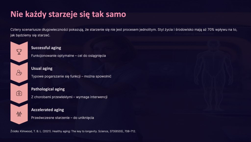 Długowieczność nie oznacza automatycznie dobrego zdrowia. W Polsce średnia długość życia wynosi około 82 lata dla kobiet i 75 lat dla mężczyzn, ale lata przeżywane w pełnym zdrowiu to jedynie 61–65 (GUS, 2024). Oznacza to, że przeciętnie ostatnia dekada, a nawet dwie dekady życia, spędzane są z chorobami przewlekłymi, ograniczeniami ruchowymi i zależnością od innych.