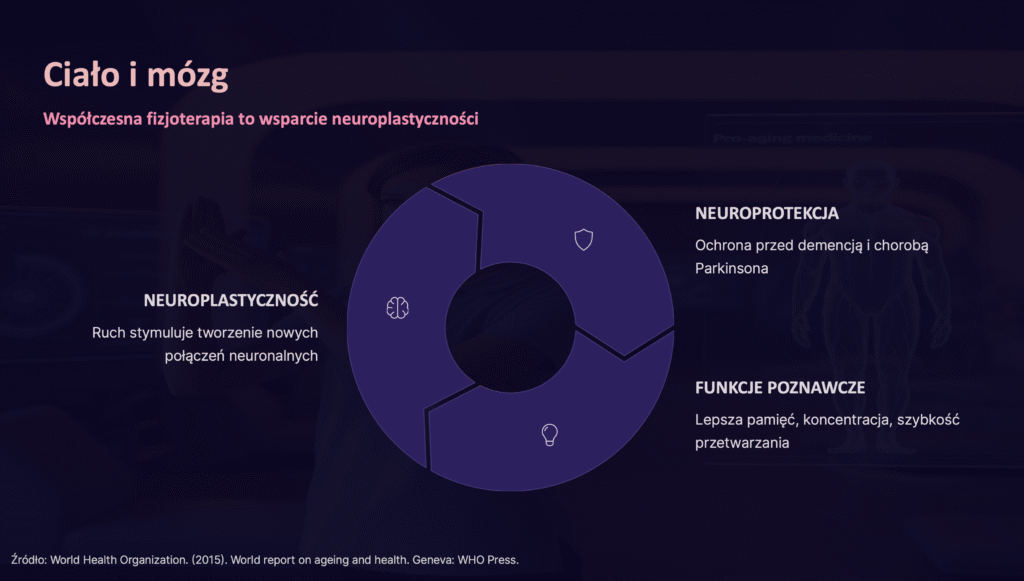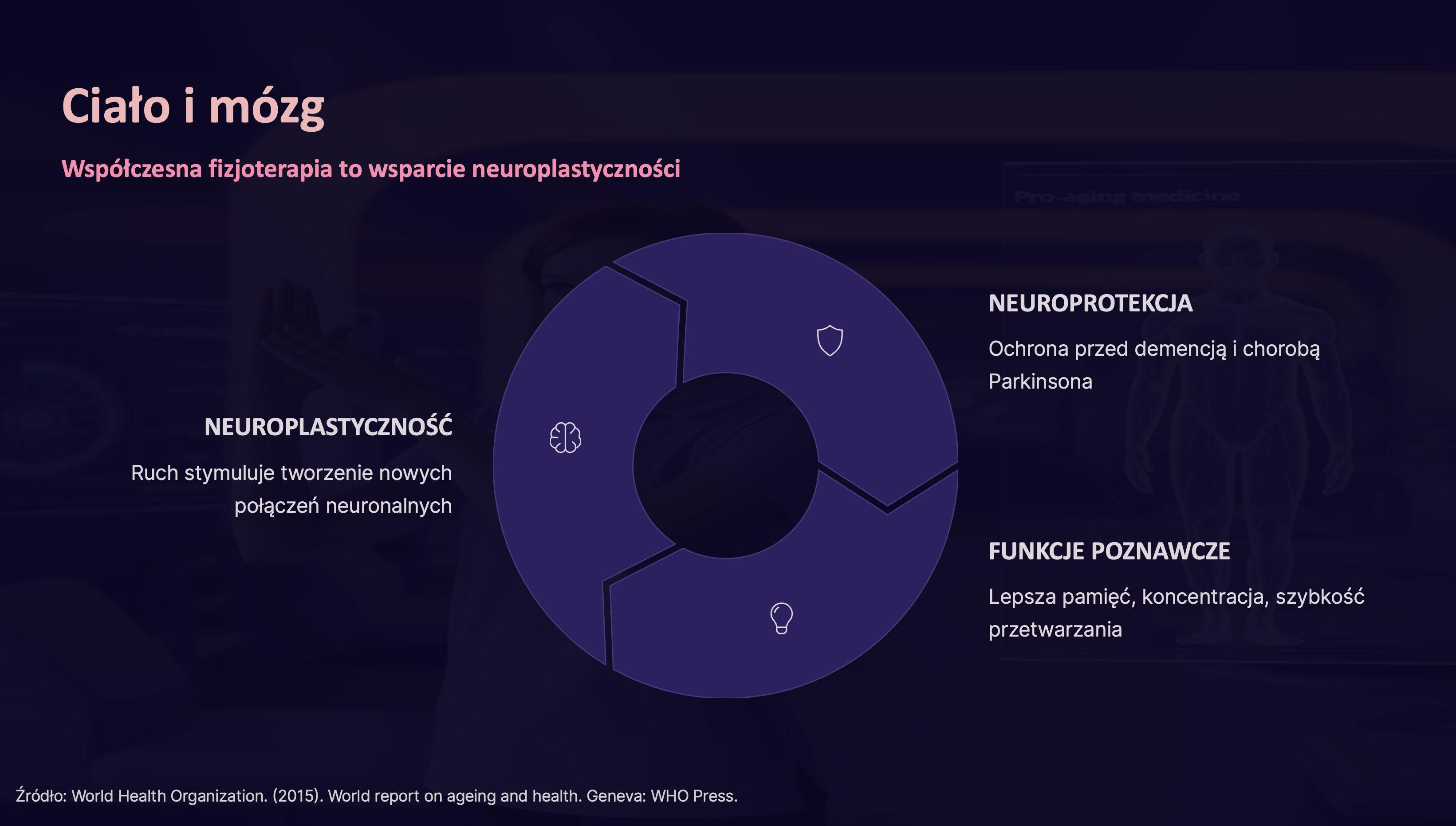Podkreśla się, że celem medycyny prozdrowotnej i geriatrii nie jest wyłącznie wydłużenie życia, ale zapewnienie możliwie długiego okresu samodzielności i dobrej jakości życia. W tym procesie kluczową rolę odgrywa ruch – uznawany przez WHO za jedną z najskuteczniejszych interwencji prozdrowotnych (WHO, 2020). To właśnie tu kompetencje fizjoterapeutów mogą stać się jednym z ważniejszych narzędzi wspierających zdrową długowieczność.