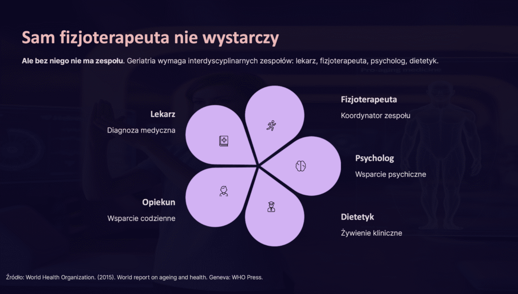 Mimo rosnących potrzeb zdrowotnych osób starszych, fizjoterapia w Polsce nie jest jeszcze w pełni włączona do strategii zdrowia publicznego. Kompetencje fizjoterapeutów są dobrze udokumentowane, a ich działania skutecznie przedłużają lata życia w zdrowiu, jednak system ochrony zdrowia korzysta z nich jedynie fragmentarycznie.