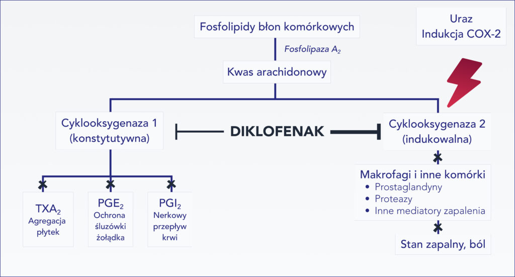 Większość NLPZ w różnym stopniu hamuje aktywność obu izoenzymów, przy czym hamowanie COX-2 jest związane z ich działaniem terapeutycznym, zaś hamowanie COX-1 odpowiada za większość działań niepożądanych tej grupy leków (część działań niepożądanych wynika z hamowania konstytutywnej COX-2). Diklofenak ok. 4-krotnie silniej hamuje COX-2 niż COX-1, dzięki czemu, w porównaniu z innymi NLPZ, rzadko powoduje działania niepożądane w obrębie przewodu pokarmowego (przy stosowaniu ogólnoustrojowym) [11].
